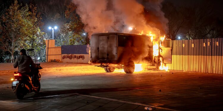 A vehicle burns during protests in Tehran, Iran, Jan. 8, 2026. (Khosh Iran/Middle East Images/AFP via Getty Images)