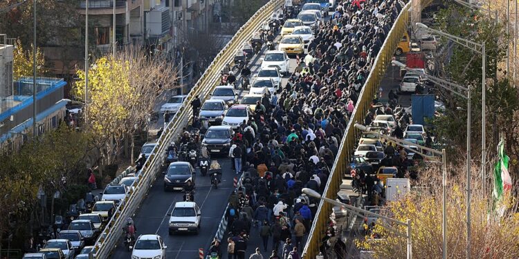 Protesters march in downtown Tehran, Iran, Monday, Dec. 29, 2025. (Fars News Agency via AP)