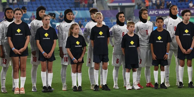Team Iran listen national anthems before the AFC Women’s Asian Cup Australia 2026 football match between South Korea and Iran in Gold Coast on March 2, 2026.  (Izhar Khan / AFP)