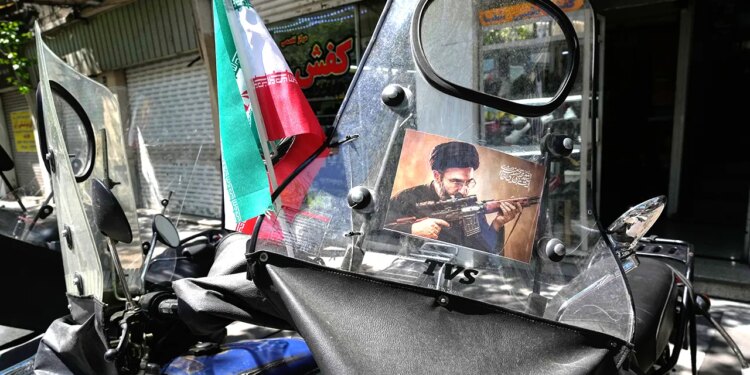 A poster of Ayatollah Mojtaba Khamenei is pasted on a motorcycle windshield as government supporters gather in Tehran on April 9, 2026, marking the 40th day since the killing of his father, Supreme Leader Ayatollah Ali Khamenei. (Vahid Salemi/AP)