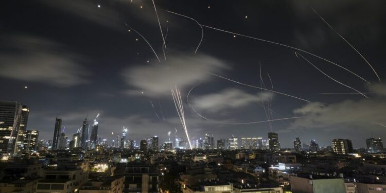 The Israeli Iron Dome air defense system fires to intercept missiles during an Iranian attack over Tel Aviv, Israel, early Wednesday, June 18, 2025. (AP Photo/Leo Correa)