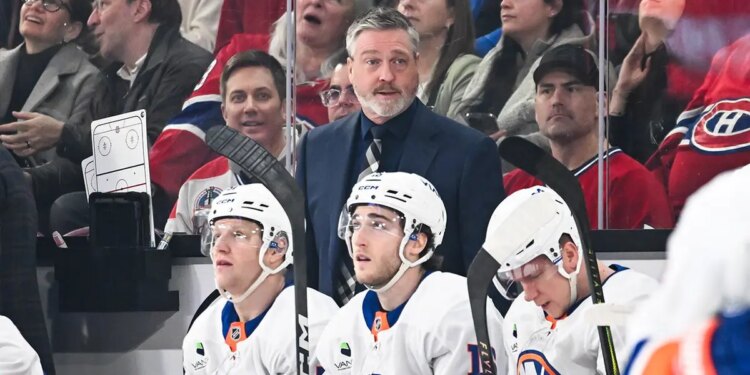 Head coach Patrick Roy of the New York Islanders manages bench duties during the first period against the Montreal Canadiens at the Bell Centre in Montreal, Quebec, on March 21, 2026. (Minas Panagiotakis/Getty Images)