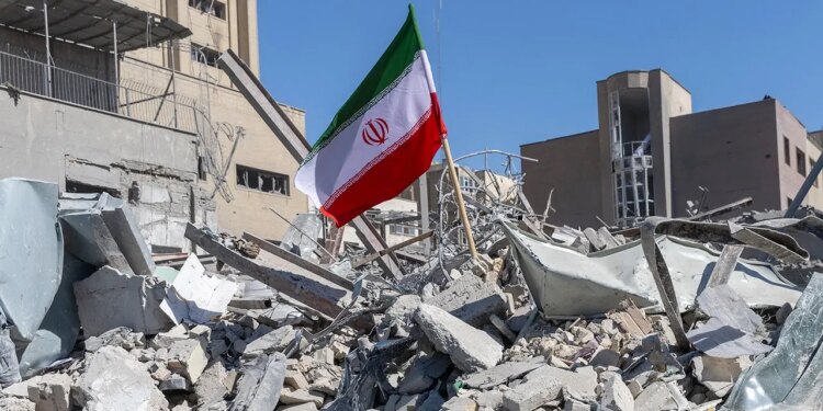Iranian flag on pile of rubble