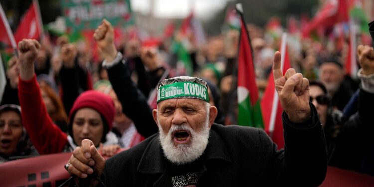 People protest in support of Palestinians in Gaza during a protest rally in Istanbul, Turkey, on Feb. 17, 2024, amid the ongoing war between Israel and Hamas. (AP Photo/Khalil Hamra)