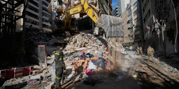 A Lebanese civil defence worker looks on as an excavator operates on the rubble of a building destroyed in an Israeli air strike a day earlier in Beirut, Lebanon [Hussein Malla/AP]
