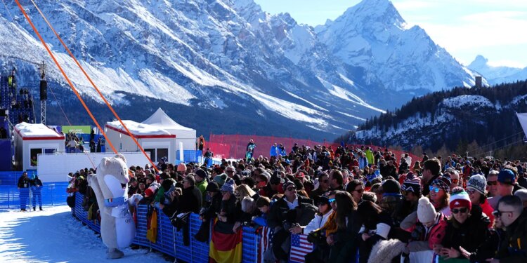 A general view of the Tofane mountains as the Winter Olympic Mascot, Tina, greets the crowd ahead of the Women’s Alpine Downhill Skiing at the Tofane Alpine Skiing Centre, Cortina d’Ampezzo, on day two of the Milan Cortina 2026 Winter Olympics. ( Andrew Milligan/PA Images via Getty Images)