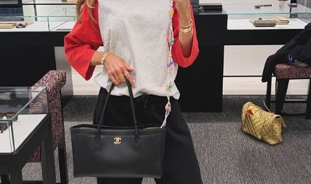 The TV personality toted a £15,000 black Birkin bag and pulled a small suitcase, appearing in great spirits as she modelled a pair of stylish shades and posed for snaps.