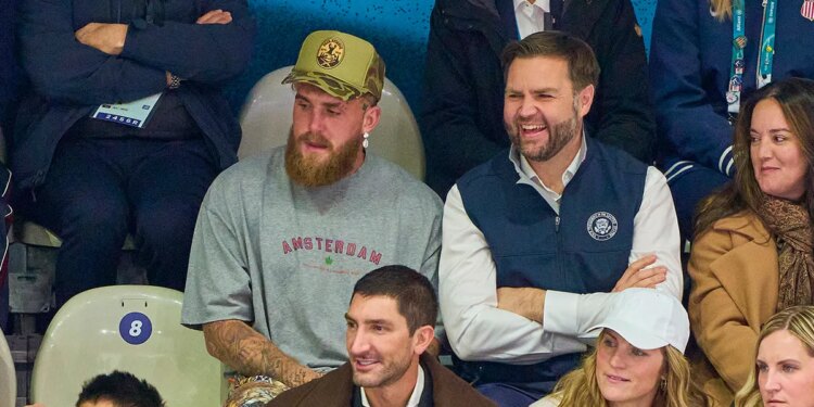 Boxer Jake Paul and Vice President JD Vance are seen in the stands during the Women’s Preliminary Round Group B match between the USA and Finland on day one of the Milano Cortina 2026 Winter Olympic Games at Milano Rho Ice Hockey Arena on Feb. 7, 2026 in Milan, Italy. (EyesWideOpen/Getty Images)