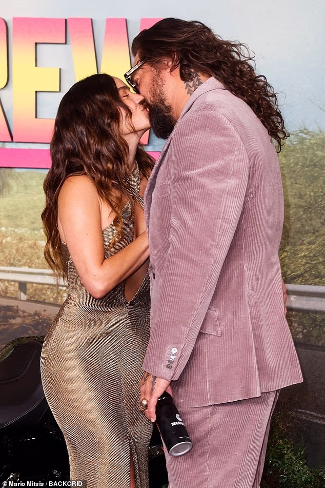 Jason Momoa, 46, shared a steamy kiss with his girlfriend Adria Arjon, 33, at the premiere of his new movie The Wrecking Crew in London’s Leicester Square on Thursday