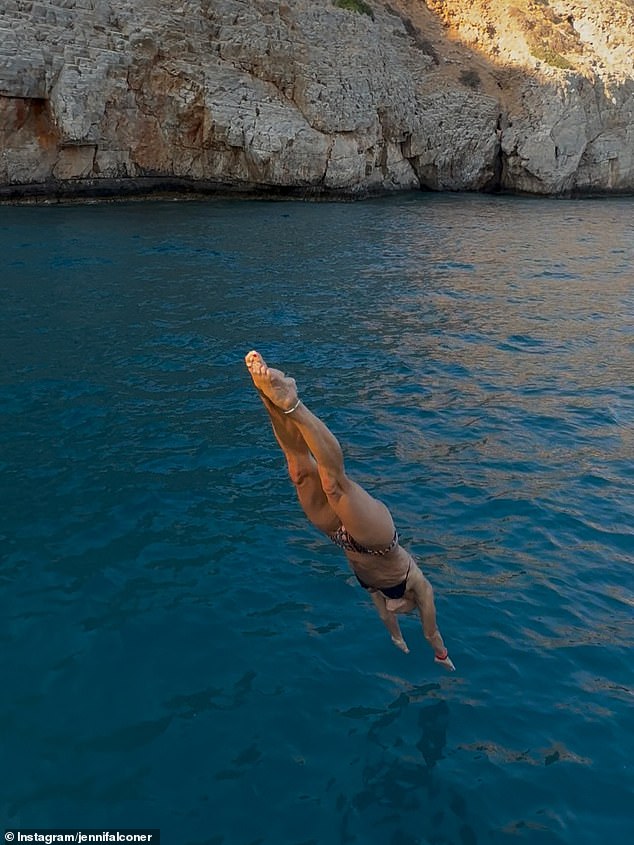 Jenni captured plenty of jaw-dropping sunset views and elsewhere her, James and Ella dipping into the crystalline waters as they waved to the lense.