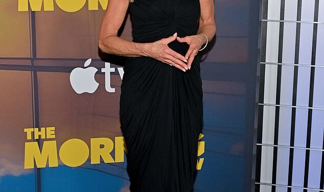 The 56-year-old film and television star showcased her fit figure in a slinky black dress as she headed to the premiere of season four of her popular Apple TV+ series The Morning Show.