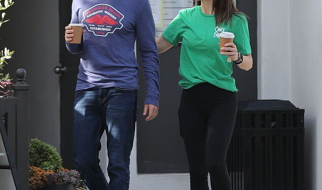 On this recent outing, both were dressed casually as they picked up coffee in Los Angeles: he had on a Wrangler denim shirt and she wore a top with the logo of her Once Upon A Farm company.