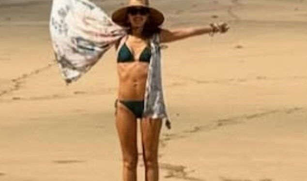 Another photo showed her relaxing by a stream in a multi-toned floral two-piece with her legs and hips in the cool, clear water.