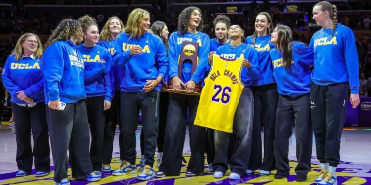 The UCLA Bruins women’s basketball team is honored at center court during a game between the Lakers and Oklahoma Thunder at Crypto.com Arena in Los Angeles on April 7, 2026. (Robert Gauthier/Los Angeles Times)