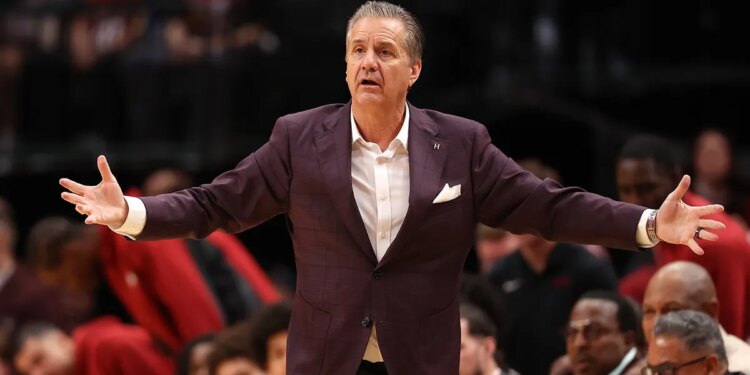 Head coach John Calipari of the Arkansas Razorbacks reacts during the second half against the Texas Tech Red Raiders at American Airlines Center on Dec. 13, 2025 in Dallas, Texas. (Sam Hodde/Getty Images)