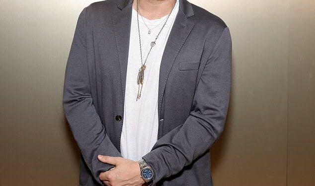At the starry event celebrating luxury watchmaker Audemars Piguet, he confidently embraced his salt-and-pepper temples, pairing his silver strands with a laid-back look and a stylish pair of glasses; (pictured with Ginny Wright and Chloe Flower)