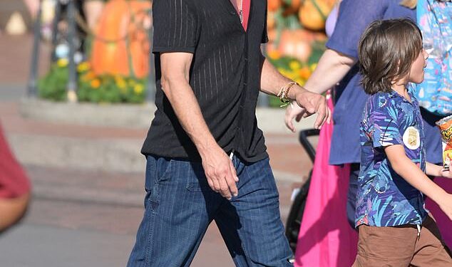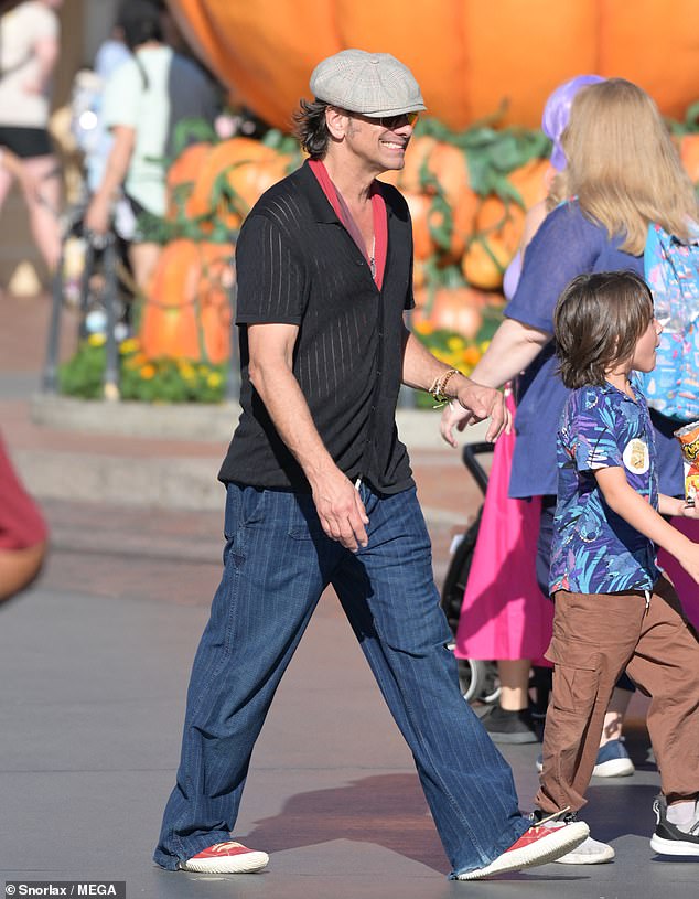John Stamos, 62, looked like he was on top of the world when he visited Disneyland with his wife Caitlin McHugh, 39, and their son Billy, seven, on Tuesday in Anaheim, Calif.