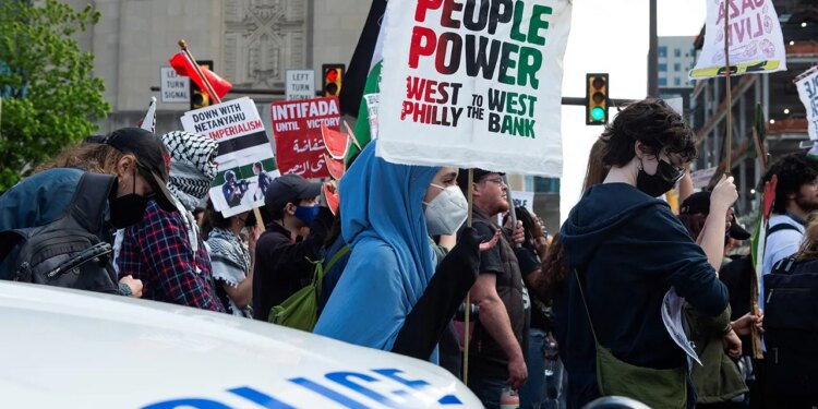 Anti-Israel protesters march against the war in Gaza in Philadelphia, Pa., April 25, 2024. (Matthew Hatcher/AFP via Getty Images)