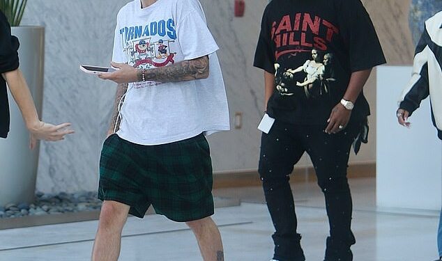 Bieber flashed his tattoos in a graphic print tee and shorts while Massey, 33 – who played Cory Baxter on the Disney show – wore an all-black ensemble with a red baseball cap