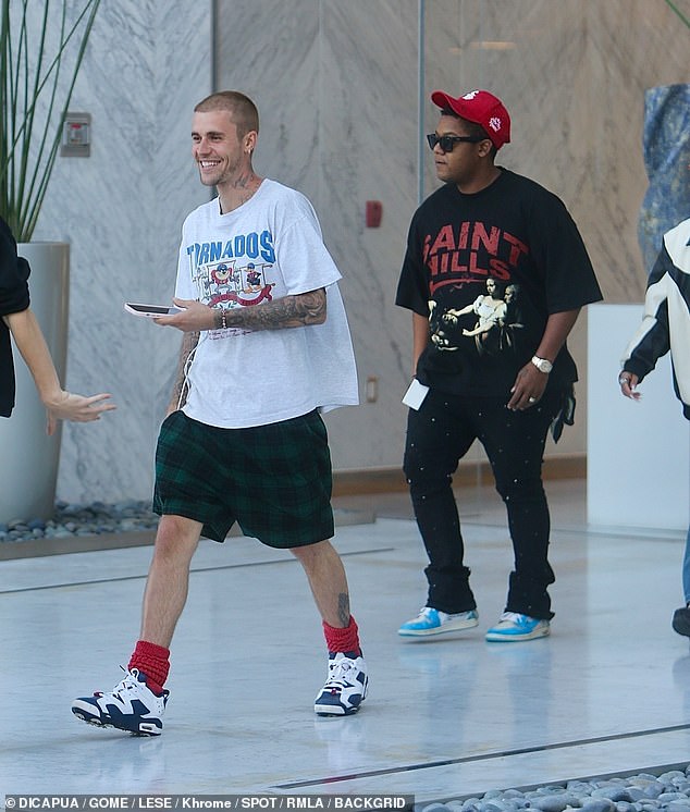 Bieber flashed his tattoos in a graphic print tee and shorts while Massey, 33 - who played Cory Baxter on the Disney show - wore an all-black ensemble with a red baseball cap