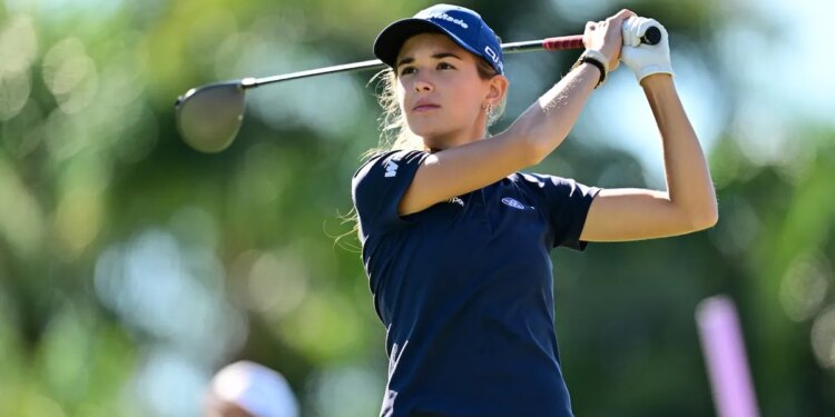 Amateur Kai Trump of the United States plays her shot from the 16th tee during the first round of The ANNIKA driven by Gainbridge at Pelican Golf Club in Belleair, Fla., on Nov. 13, 2025. (Julio Aguilar/Getty Images)