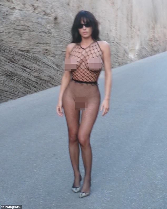 Just recently, she faced backlash after baring her breasts in a see-through top, much like this week’s post, during a public outing in Spain with the rapper; pictured February in Los Angeles