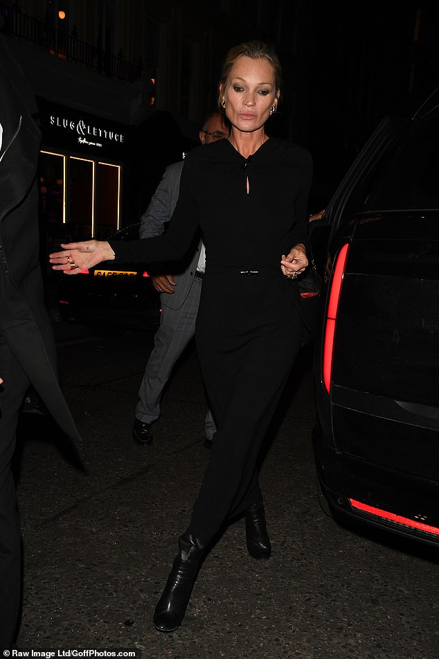 Supermodel Kate, 51, sported a sleek all-black ensemble for the high-brow event on Thursday night as she rocked a maxi dress with leather boots