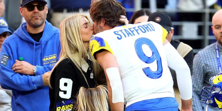 Kelly Hall and Los Angeles Rams quarterback Matthew Stafford (9) kiss before the game at State Farm Stadium in Glendale, Arizona, on Dec. 7, 2025. (Mark J. Rebilas/Imagn Image)