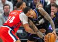From there, the ad leaned fully into the mythology surrounding her dating history, with Jenner quipping that ‘any basketball player who dates me kind of hits a rough patch,’ before striking a match and tossing it into a basket overflowing with basketball jerseys.