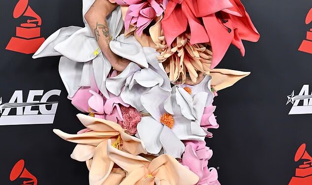 The singer, 38, turned heads as she stepped out in a nude gown covered from head-to-toe in voluminous fabric flowers in an array of pink, white and orange shades.