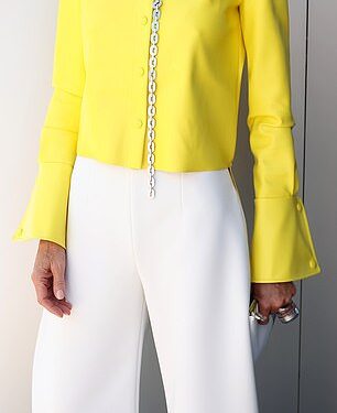 Trinny beamed in a bright lemon crepe jacket that flared at the cuffs and featured a dramatic collar for the outing.