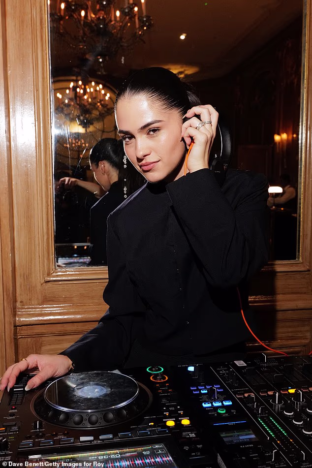 Romeo Beckham’s girlfriend Kim looked effortlessly chic in an all-black ensemble featuring capri leggings and a matching zipped top for her DJ set.