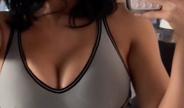 She flashed her slim waistline in the low-cut sports bra paired with matching, gray leggings that hugged her physique. ‘Love this new color,’ she wrote over a clip of herself posing on the back of a couch