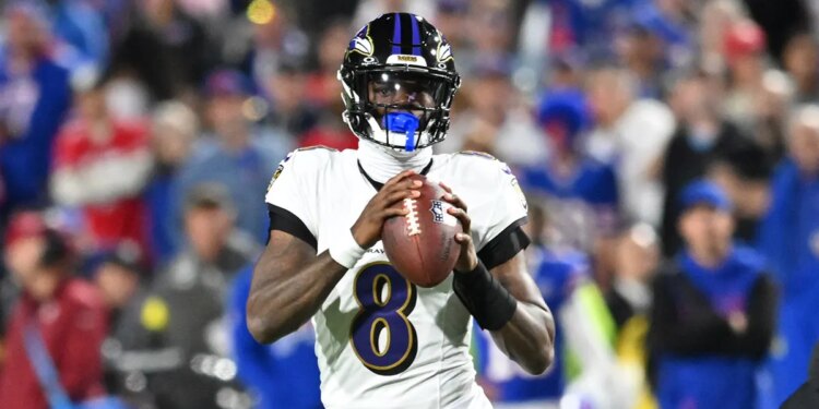 Baltimore Ravens quarterback Lamar Jackson (8) looks to pass during the first quarter against the Buffalo Bills at Highmark Stadium on Sept. 7, 2025. (Mark Konezny/Imagn Images)