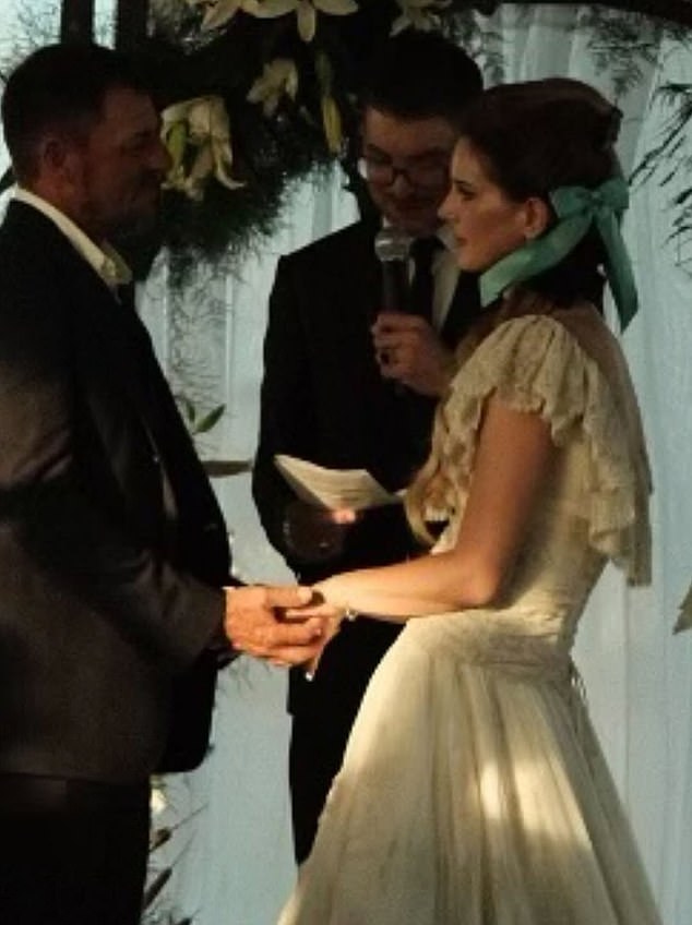 Wearing a simple ivory gown with oversized ruffled shoulders and a big blue bow in her hair, Lana held hands with Dufrene, 49, as they stood before a minister holding what appeared to be a Bible.
