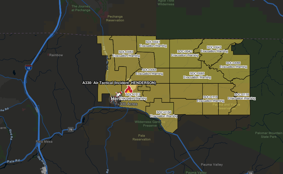 The Henderson Fire is burning along the 35000 block of Henderson Road, north of Highway 76 in Pala, at a moderate rate of spread in grass and brush.