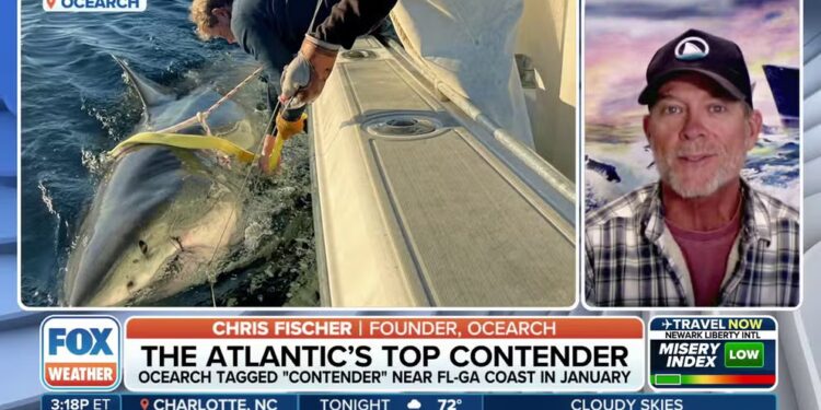 Video from OCEARCH shows Contender, a massive adult great white shark being tagged off the Florida/Georgia coast in January 2025. Contender is the largest recorded great white shark in the Atlantic.