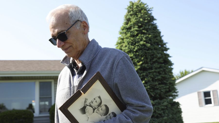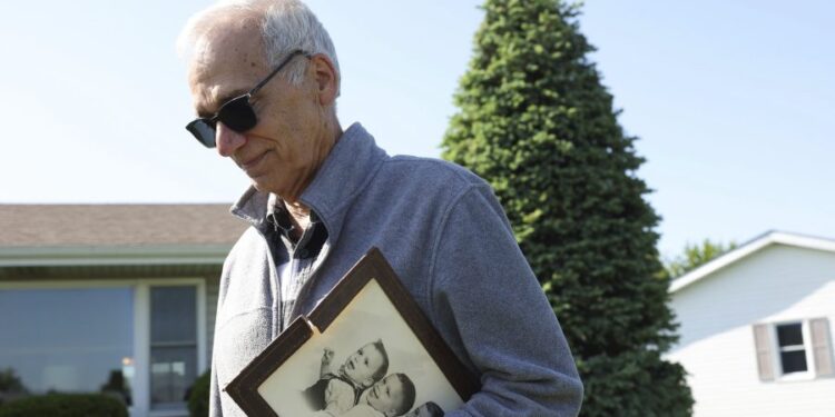 John Prevost, brother of new Pope Leo XIV, holds a portrait of the three Prevost brothers from 1958 while answering reporters’ questions outside his home Thursday, May 8, 2025, in New Lenox, Ill. (John J. Kim/Chicago Tribune via AP)
