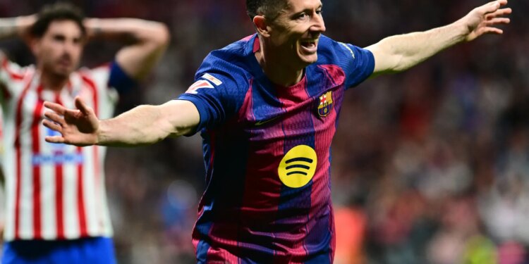 Robert Lewandowski shouldered home a dramatic late winner for Barcelona as they edged Atletico Madrid 2-1 to move seven points clear at the top of La Liga after Real Madrid slipped up.