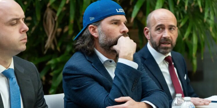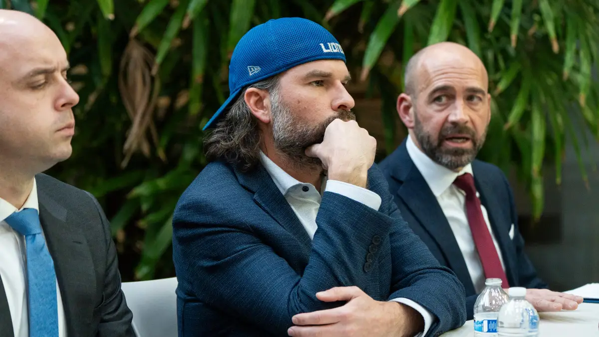 Detroit Lions fan Ryan Kennedy, center, seated next to attorney Sean Murphy, left, and attorney Shawn Head, right, while discussing the fan-involved altercation with Pittsburgh Steelers player DK Metcalf at the Head Murphy Law office in Farmington Hills, Michigan on Dec. 26, 2025. (Ryan Garza/USA TODAY NETWORK via Imagn Images)
