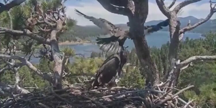 “Sunny looked afraid,” said Sandy Steers with Friends of Big Bear Valley, the nonprofit that manages the eagle cam. “When he went back, he let the wind carry him back to the nest, and he laid down for over two hours.”