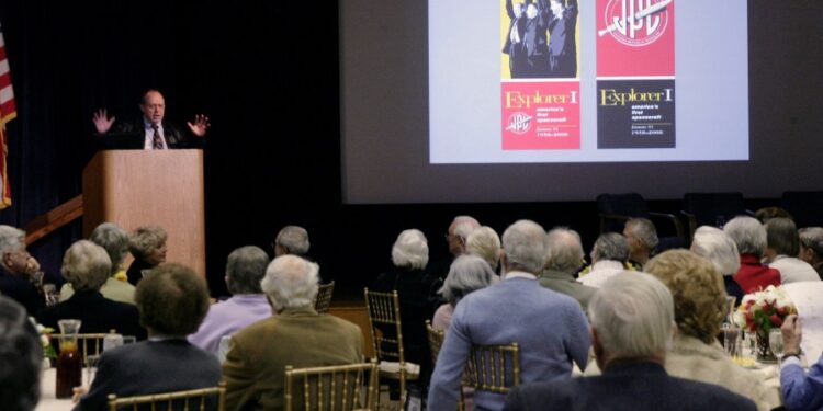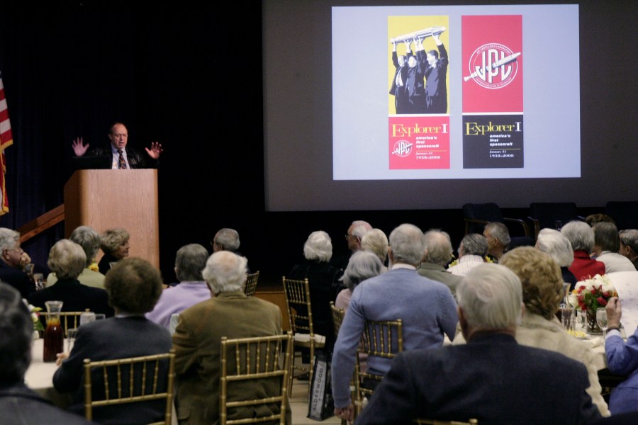 John Casani, left, a former program manager with the Jet Propulsion Laboratory, addresses employees, who worked on Explorer 1 in 1958, during the 50th anniversary celebration of the launching of the first U.S. satellite Wednesday, Jan. 30, 2008, in Pasadena, Calif. (AP Photo/Ric Francis)