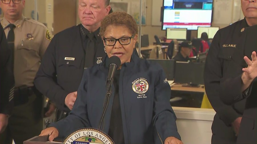 L.A. Mayor Karen Bass speaks at a press conference ahead of planned “No Kings Day” protests on June 14, 2025. (KTLA)