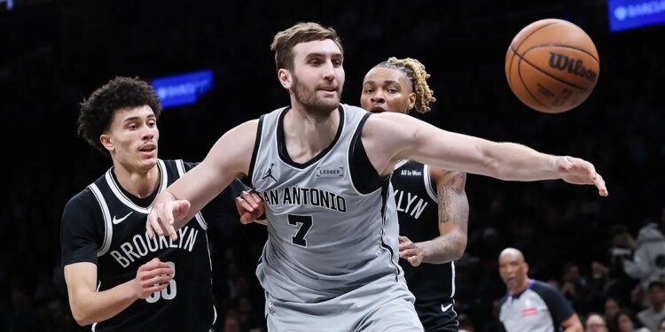 Luke Kornet of the San Antonio Spurs reaches for the ball during the third quarter against the Brooklyn Nets at Barclays Center on Feb. 26, 2026 in the Brooklyn borough of New York City. (Ishika Samant/Getty Images)