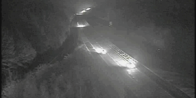 Nighttime traffic camera view of a highway with car headlights visible.