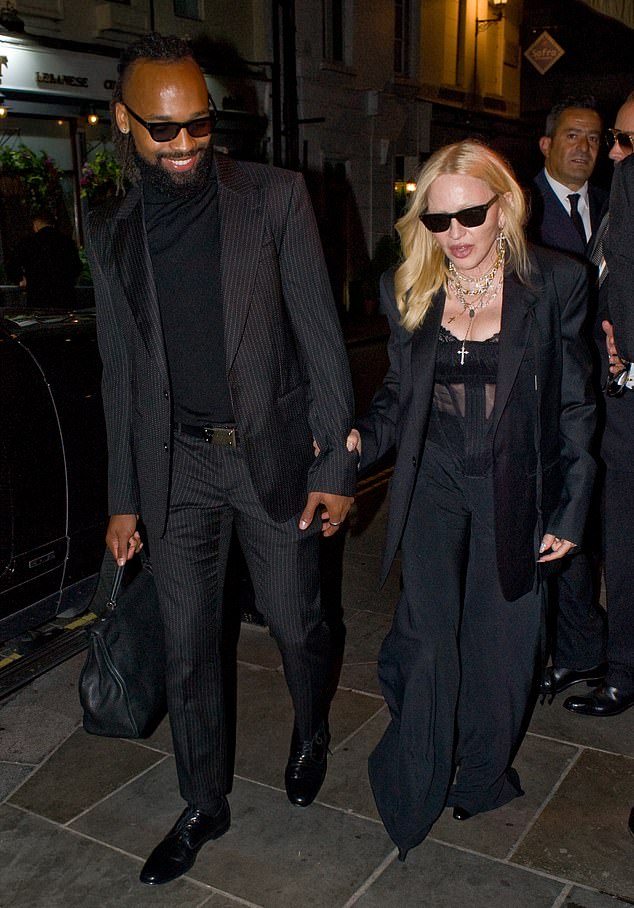 Madonna strolled hand-in-hand with boyfriend Akeem Jeffries as they enjoyed a swanky night out at private member’s club Lou Lou’s in London’s Mayfair on Thursday.