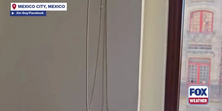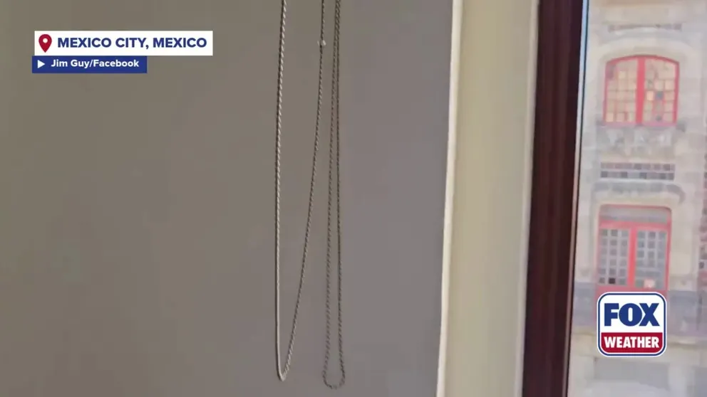 Window shade pull chains swing as a magnitude 6.5 earthquake shakes Mexico City.