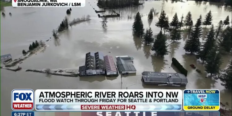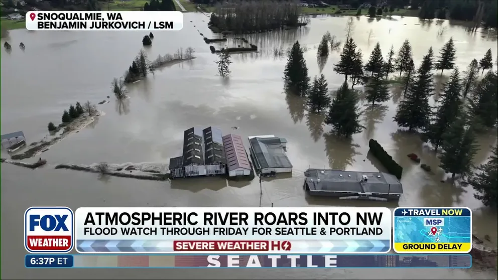 A powerful atmospheric river is roaring in the Pacific Northwest and is continuing to slam the region. Major flooding from the Snoqualmie River inundated several areas adjacent to the river in Fall City, as the powerful atmospheric river is expected to continue to soak the region.