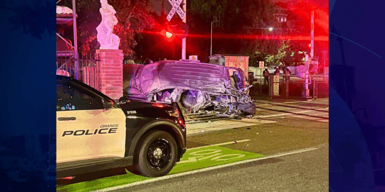 A man was hospitalized in critical condition after he allegedly drove his car under a railroad barrier and was struck by a passenger train in Orange on April 17, 2025. (Orange Police Department)