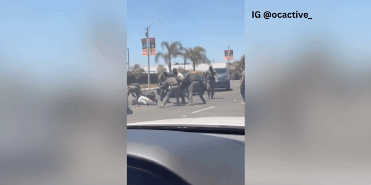 This incident, less than two and a half miles from where Narciso Barranco, a landscaper, was repeatedly struck and arrested after federal authorities claim he assaulted them with a weed trimmer, reportedly unfolded at around 2:30 p.m. Sunday at the intersection of Warner Avenue and Main Street.